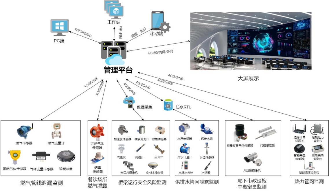 搭建城市安全感知网,部署智能感知设备于地下管网、桥梁、隧道等关键设施,实现城市生命线工程的全面感知、自动采集、监测分析、预警上报、及时处置。