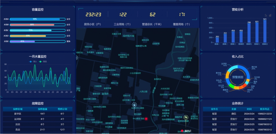 基于物联网、大数据、云计算及BIM/GIS等技术,构建城市供水安全智能监测平台,实现对供水管网设施、水质、压力、流量的实时监测与预警。保障供水稳定,预防大面积停水事故,并为管网泄漏分析、用水